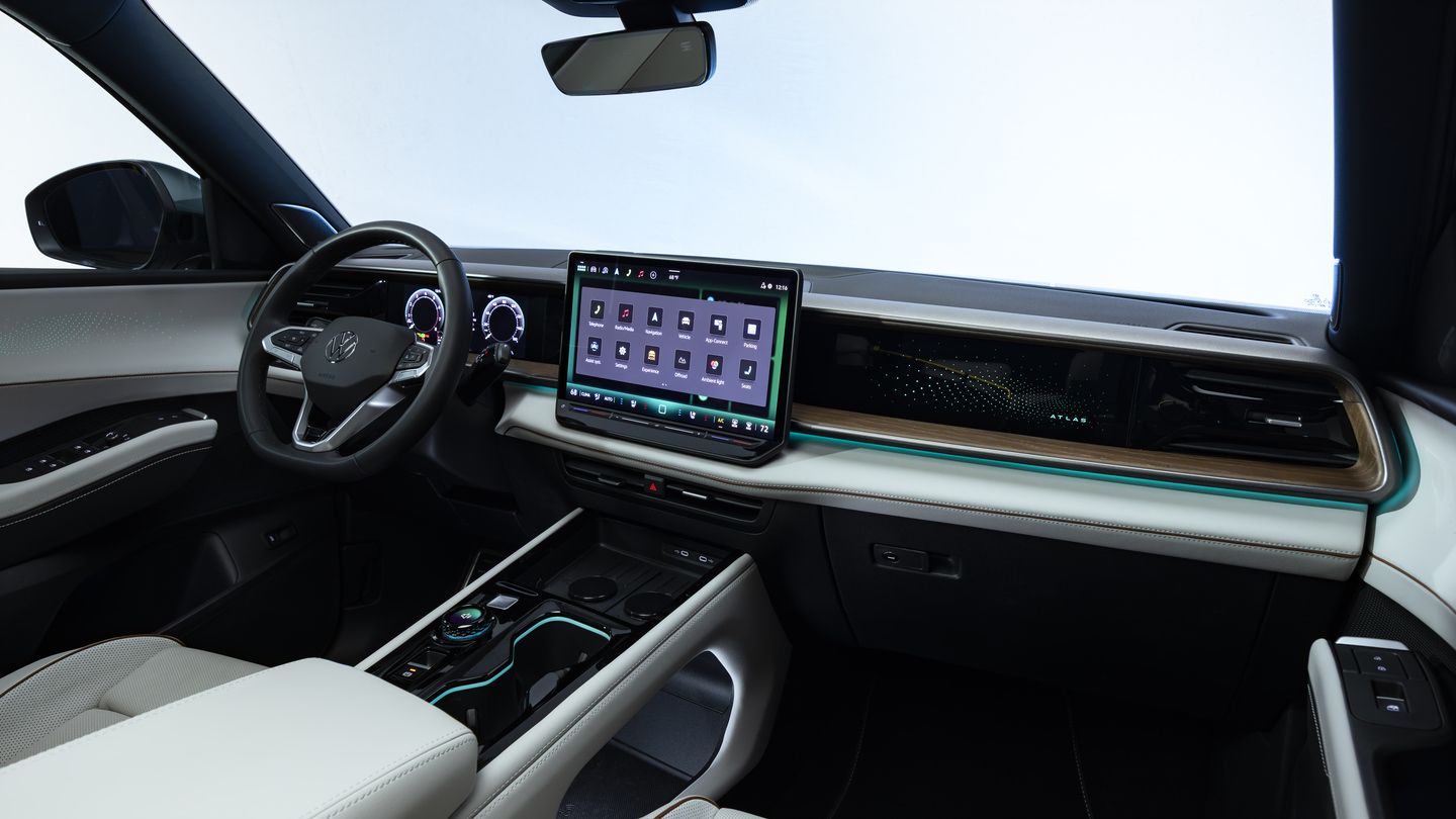 The interior is where the 2027 Atlas makes its strongest case. A bold architectural loop unifies the cockpit, flowing from the displays through the vents and lighting in one continuous statement. Everything feels intentional - the shift lever on the steering column, the revised door handles, the artistically designed upholstery on the door panels. This cabin was designed to feel like a step up.